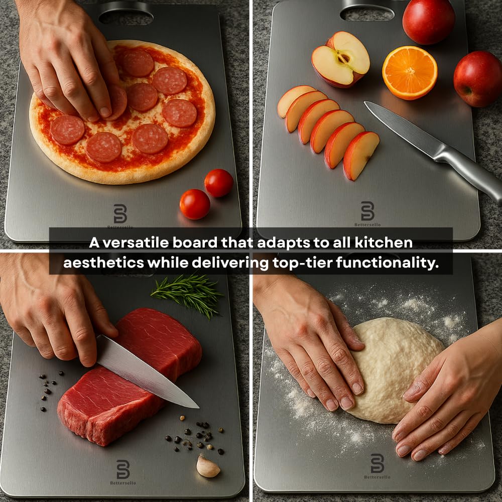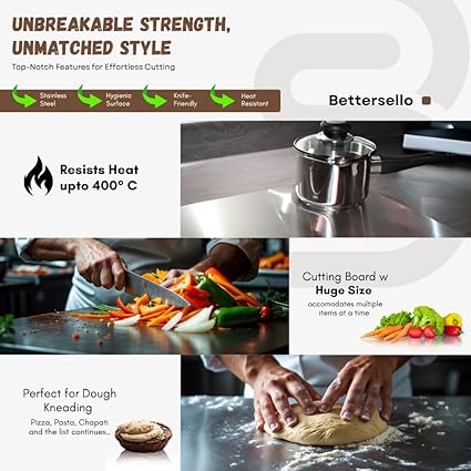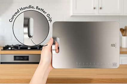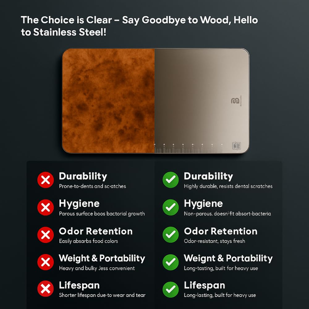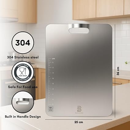 Unlike regular wood or plastic boards that retain cuts, stains, and odors, 304-grade stainless steel offers a non-porous, anti-bacterial, and highly hygienic surface. It ensures a clean chopping experience every time, making it ideal for homes where cooking safety is a priority.